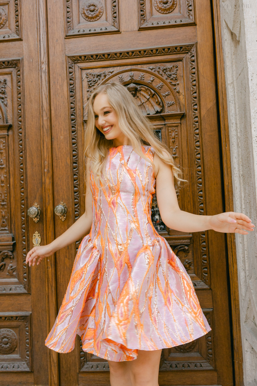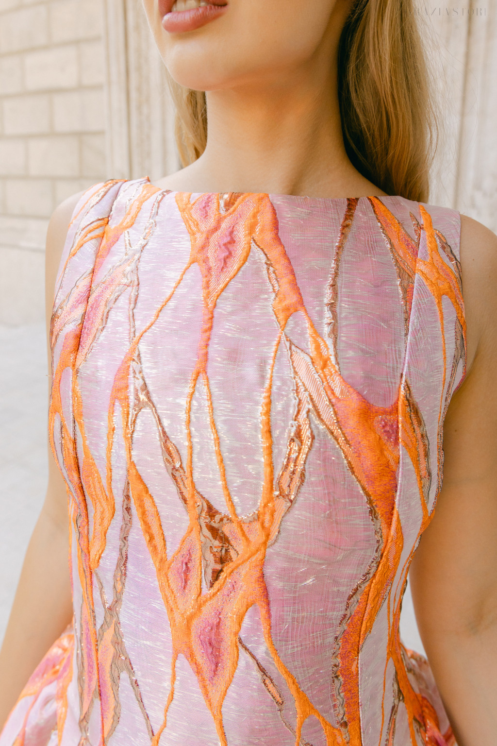 Niko mini ruha a modern nőiesség és az időtlen elegancia tökéletes egyensúlyát teremti meg. Anyagában mintás jacquard szövete púderes alapon aranyló és narancs árnyalatú, absztrakt hullámmintával díszített, amely minden mozdulatnál életre kel, és luxusfényével garantáltan magára vonja a tekinteteket. A ruha különlegessége az alacsonyabban szabott derékrész, amely kiemeli a sziluettet és azonnal divatos, nagyvárosi sikket sugároz.
