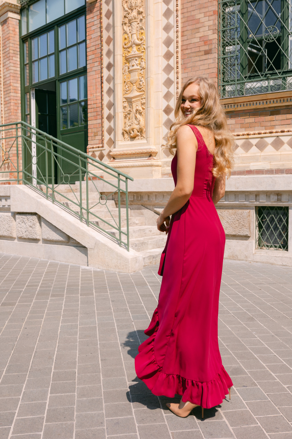 Bianka egy sötétmályva muszlinból készült, A-vonalú maxi ruha, amely kecses sliccével, aszimmetrikus fodros szoknyájával és letisztult, egyenes dekoltázsával azonnal magára vonja a tekintetet.
