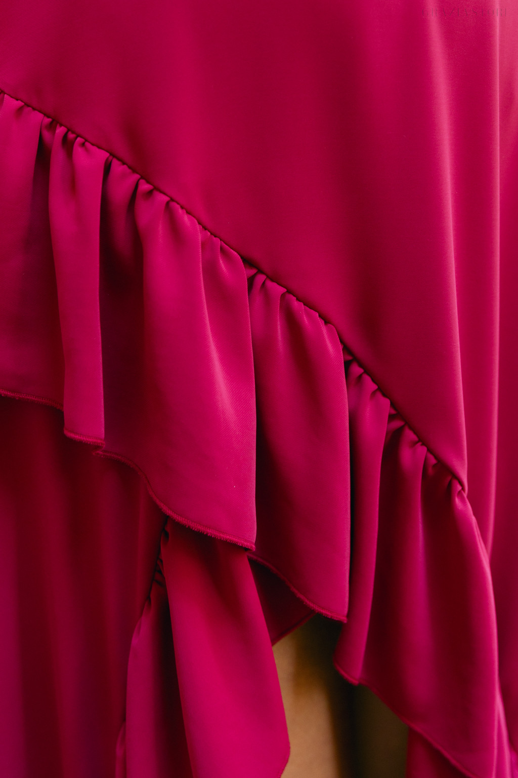 Bianka egy sötétmályva muszlinból készült, A-vonalú maxi ruha, amely kecses sliccével, aszimmetrikus fodros szoknyájával és letisztult, egyenes dekoltázsával azonnal magára vonja a tekintetet.