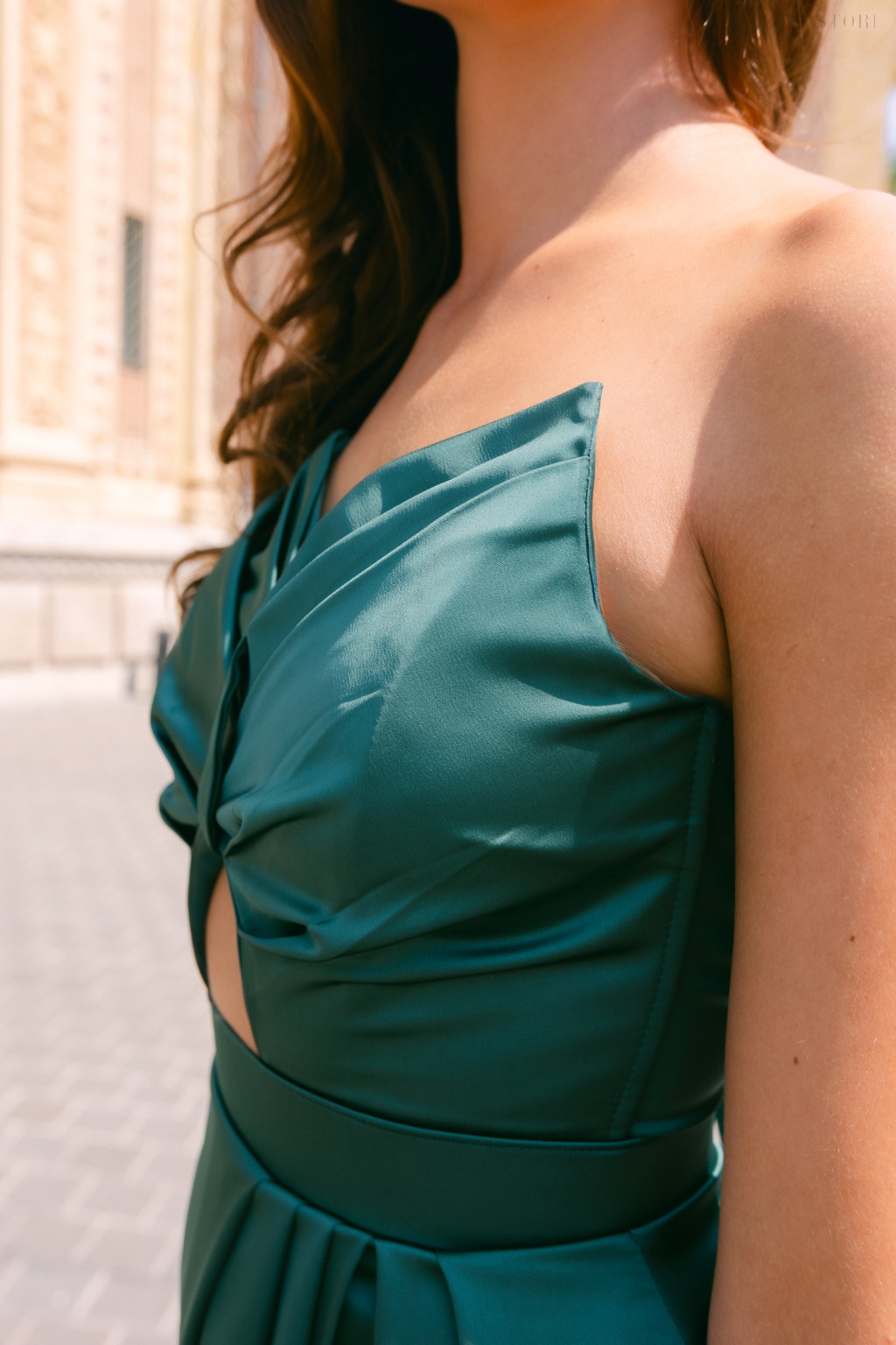 A sima szatén ragyogó felülete fényűző eleganciát sugall, miközben lágyan követi a test vonalait. A pántnélküli felsőrész kiemeli a vállak és a nyak vonalát, a dekoltázs pedig nőies, kifinomult hatást kelt. A hason elhelyezett apró nyílás játékos, modern részlet, míg a rakott, átlapolt maxi szoknya légies mozgást biztosít, optikailag nyújtva az alakot. A fűzős hátrész gondoskodik arról, hogy a ruha tökéletesen igazodjon a testhez, kiemelve a nőies sziluettet.
