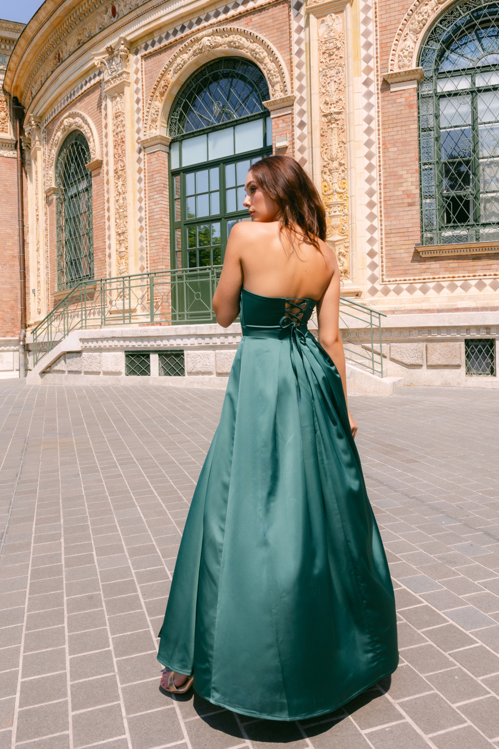 Ajsa egy sötétzöld szatén anyagból készült, pántnélküli maxi ruha, amely különleges dekoltázsával, izgalmas fűzős hátmegoldásával, rakásos, átlapolt szoknyájával és modern szabásával azonnal magára vonja a tekintetet.