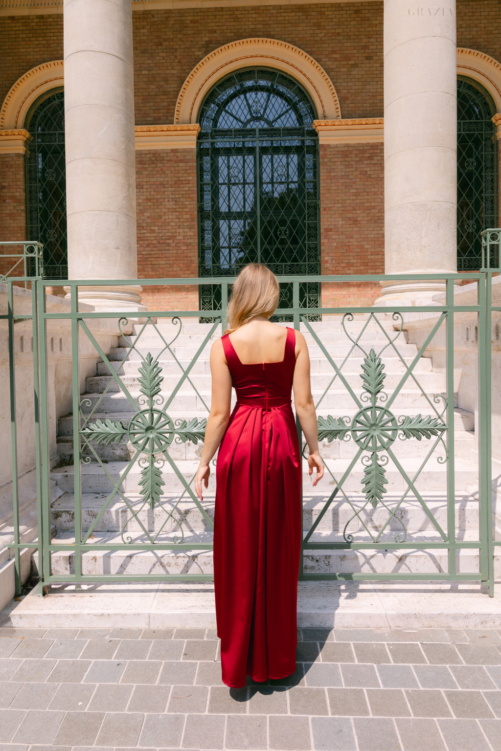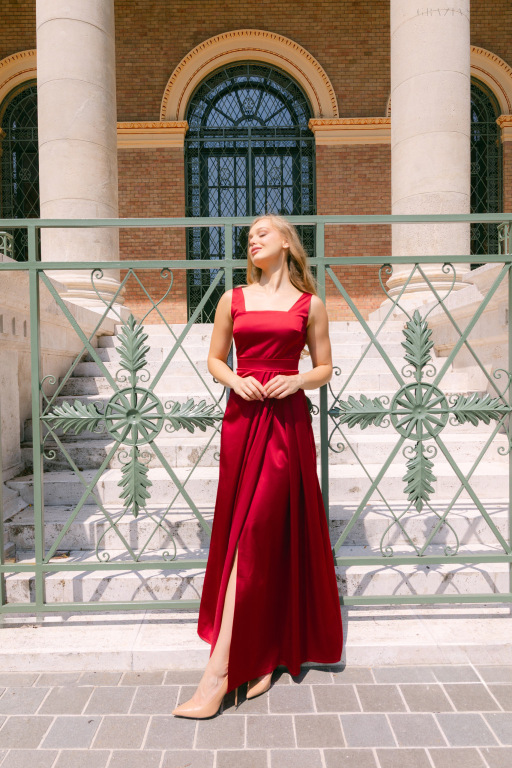 Maya egy bordópiros, menyasszonyi szaténból készült alkalmi ruha, amely letisztult, elegáns felsőrésszel és átlapolt, rakásos maxi szoknyával varázsolja el a megjelenést.