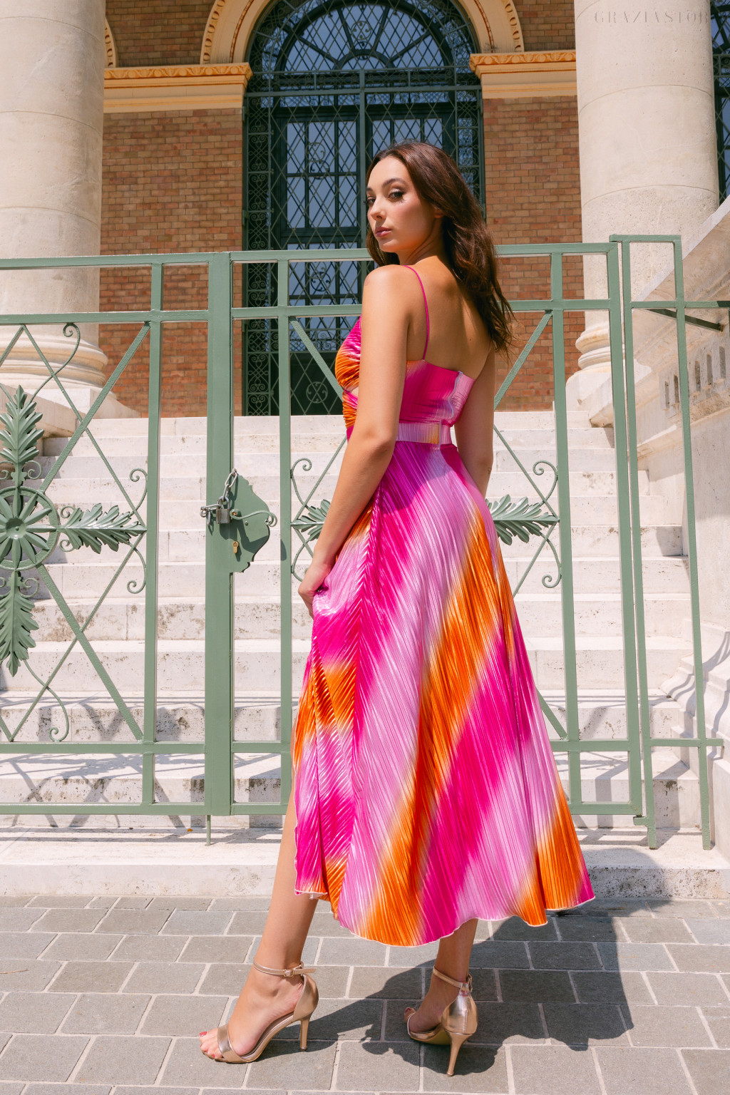 A pliszírozott anyag minden mozdulatnál elegánsan áramlik, miközben a vibráló színek – rózsaszín, narancs és pink árnyalatok – fiatalos, lendületes energiát sugároznak. A spagetti pántok kiemelik a vállak finomságát, a crop-top fazon optikailag karcsúsítja a derekat, míg a felsliccelt szoknya játékos dinamizmust kölcsönöz, diszkréten megmutatva a láb vonalát. A midi hossz modern és könnyed, így a ruha egyszerre kényelmes és feltűnően nőies.