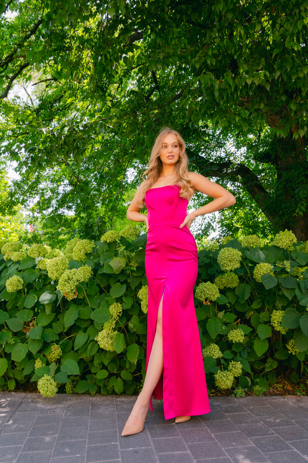 Marilyn – pántnélküli szatén maxi ruha magenta színben, sliccelt szoknyával