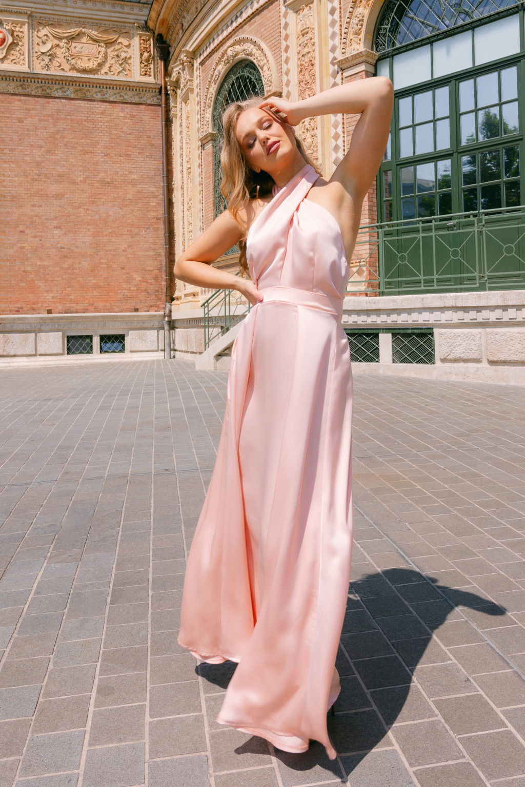 Lia púder színű lágy szatén maxi ruha maga a légies elegancia, amely minden mozdulatodhoz életet ad.