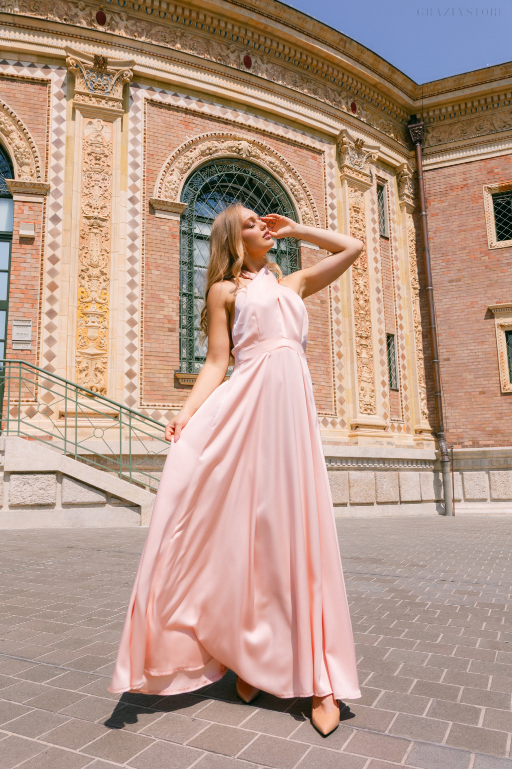 Lia púder színű lágy szatén maxi ruha maga a légies elegancia, amely minden mozdulatodhoz életet ad.