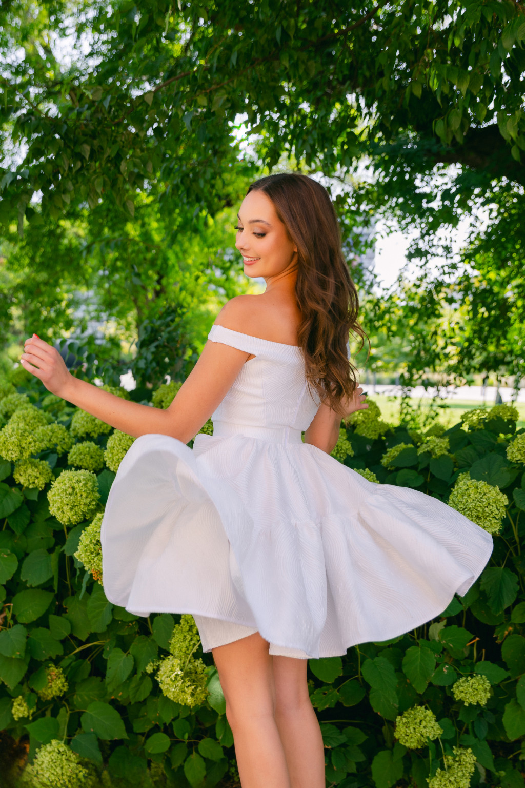 Ejtett vállai romantikus, nőies vonalat rajzolnak, finoman kiemelve a dekoltázst és a vállakat, míg a pörgős, rakott mini szoknya játékos lendületet visz minden mozdulatodba. A jacquard szövet különleges hullámos mintázata és gazdag textúrája extra mélységet és eleganciát kölcsönöz, amely még inkább kiemeli a ruha egyediségét. A fehér árnyalat tisztaságot, frissességet és letisztult ragyogást sugároz – legyen szó nappali eseményről vagy esti ünneplésről.