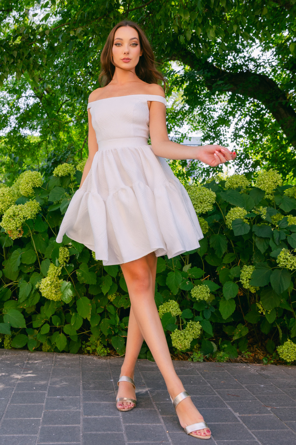 Ejtett vállai romantikus, nőies vonalat rajzolnak, finoman kiemelve a dekoltázst és a vállakat, míg a pörgős, rakott mini szoknya játékos lendületet visz minden mozdulatodba. A jacquard szövet különleges hullámos mintázata és gazdag textúrája extra mélységet és eleganciát kölcsönöz, amely még inkább kiemeli a ruha egyediségét. A fehér árnyalat tisztaságot, frissességet és letisztult ragyogást sugároz – legyen szó nappali eseményről vagy esti ünneplésről.