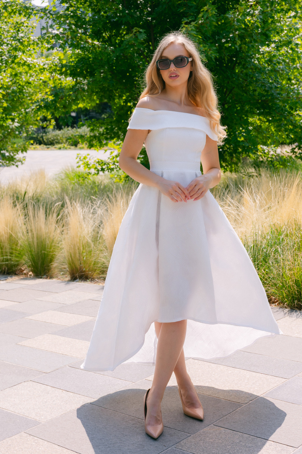Ejtett vállai romantikus nőiességet sugároznak, finoman kiemelve a vállakat és a dekoltázst, míg az aszimmetrikus maxi szoknya modern dinamizmust visz a megjelenésbe. A jacquard szövet hullámos mintázata és gazdag textúrája mélységet és luxust kölcsönöz, amely minden lépésedet különleges ragyogással tölti meg. A fehér árnyalat tisztaságot és kifinomultságot sugall – tökéletes választás nappali ünnepségekre vagy esti alkalmakra.