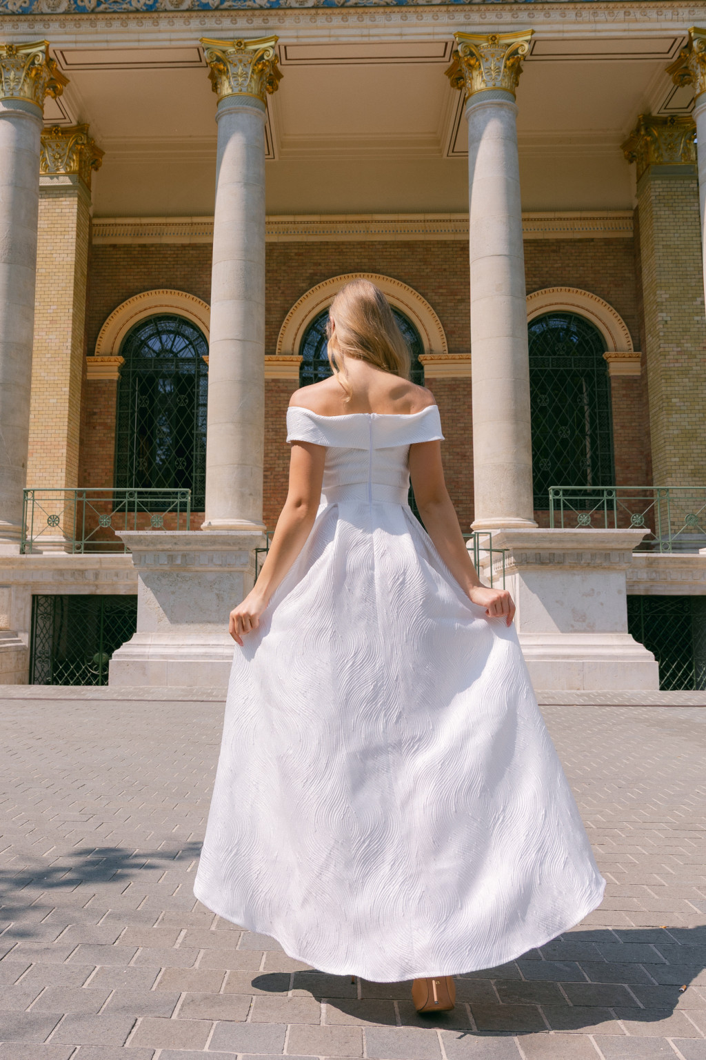Ejtett vállai romantikus nőiességet sugároznak, finoman kiemelve a vállakat és a dekoltázst, míg az aszimmetrikus maxi szoknya modern dinamizmust visz a megjelenésbe. A jacquard szövet hullámos mintázata és gazdag textúrája mélységet és luxust kölcsönöz, amely minden lépésedet különleges ragyogással tölti meg. A fehér árnyalat tisztaságot és kifinomultságot sugall – tökéletes választás nappali ünnepségekre vagy esti alkalmakra.