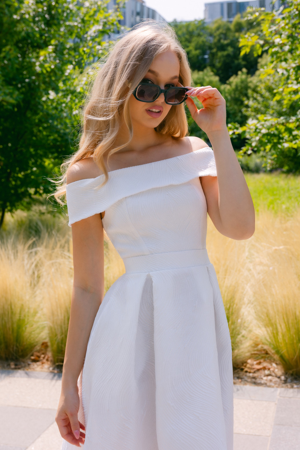 A Boundless fehér, anyagában mintás jacquard maxi ruha letisztult eleganciájával és különleges szabásvonalával azonnal rabul ejt.