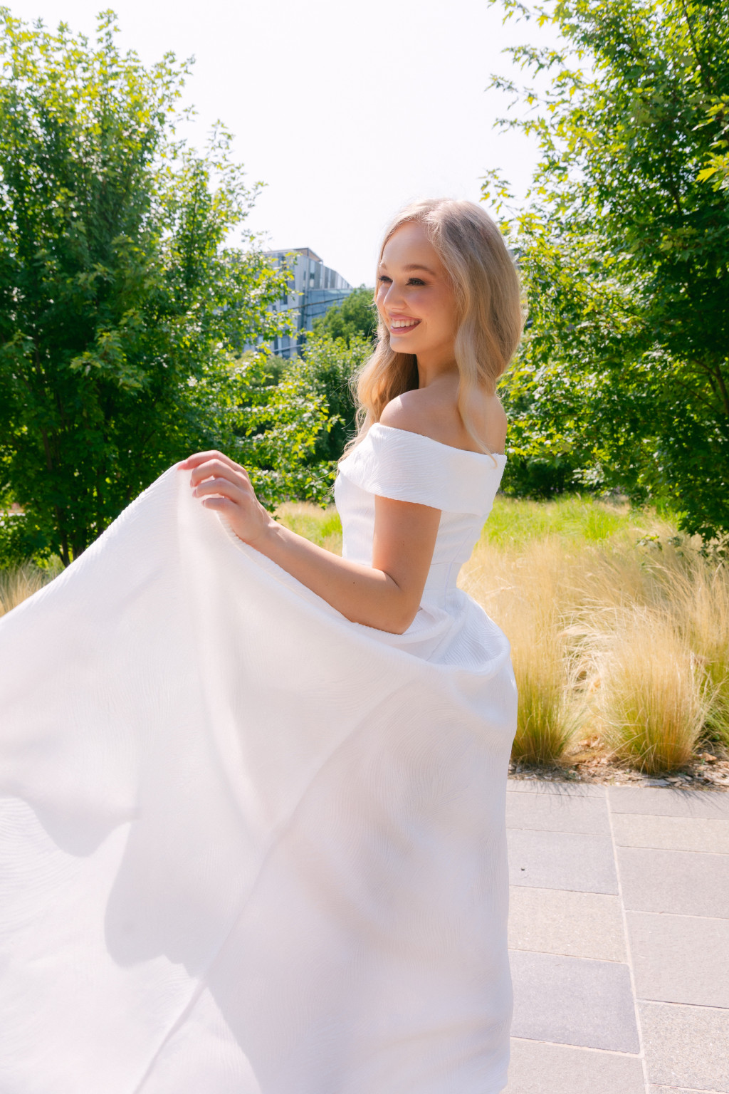 Ejtett vállai romantikus nőiességet sugároznak, finoman kiemelve a vállakat és a dekoltázst, míg az aszimmetrikus maxi szoknya modern dinamizmust visz a megjelenésbe. A jacquard szövet hullámos mintázata és gazdag textúrája mélységet és luxust kölcsönöz, amely minden lépésedet különleges ragyogással tölti meg. A fehér árnyalat tisztaságot és kifinomultságot sugall – tökéletes választás nappali ünnepségekre vagy esti alkalmakra.