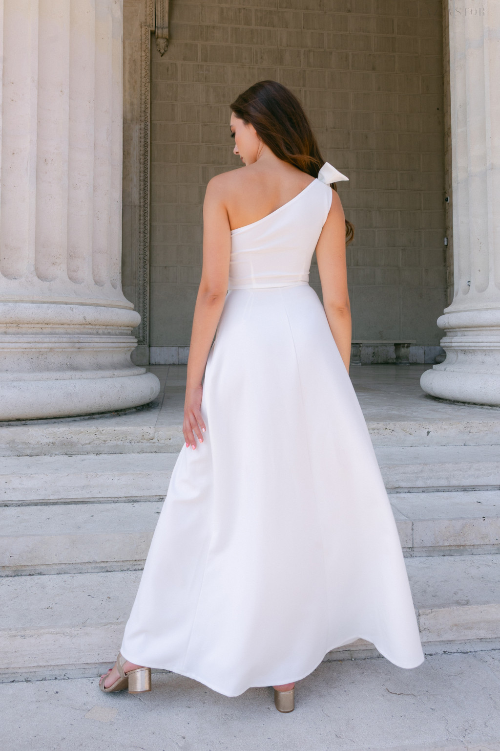Féloldalas felsőrésze egyedi és modern vonalat ad a megjelenésnek, miközben finom masnis díszítése bájos, nőies kiegészítőként emeli ki a vállat. A szoknya átlapolt szabása lágyan követi a mozgást, áramló sziluettet kölcsönözve, amely minden lépésnél romantikus könnyedséget sugároz.
