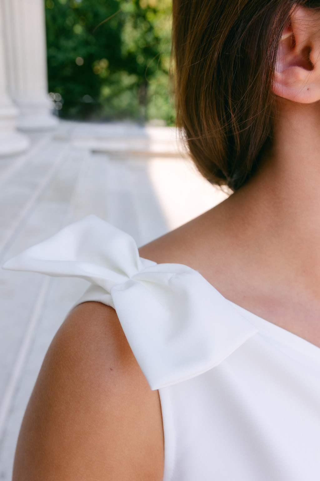 Féloldalas felsőrésze egyedi és modern vonalat ad a megjelenésnek, miközben finom masnis díszítése bájos, nőies kiegészítőként emeli ki a vállat. A szoknya átlapolt szabása lágyan követi a mozgást, áramló sziluettet kölcsönözve, amely minden lépésnél romantikus könnyedséget sugároz.