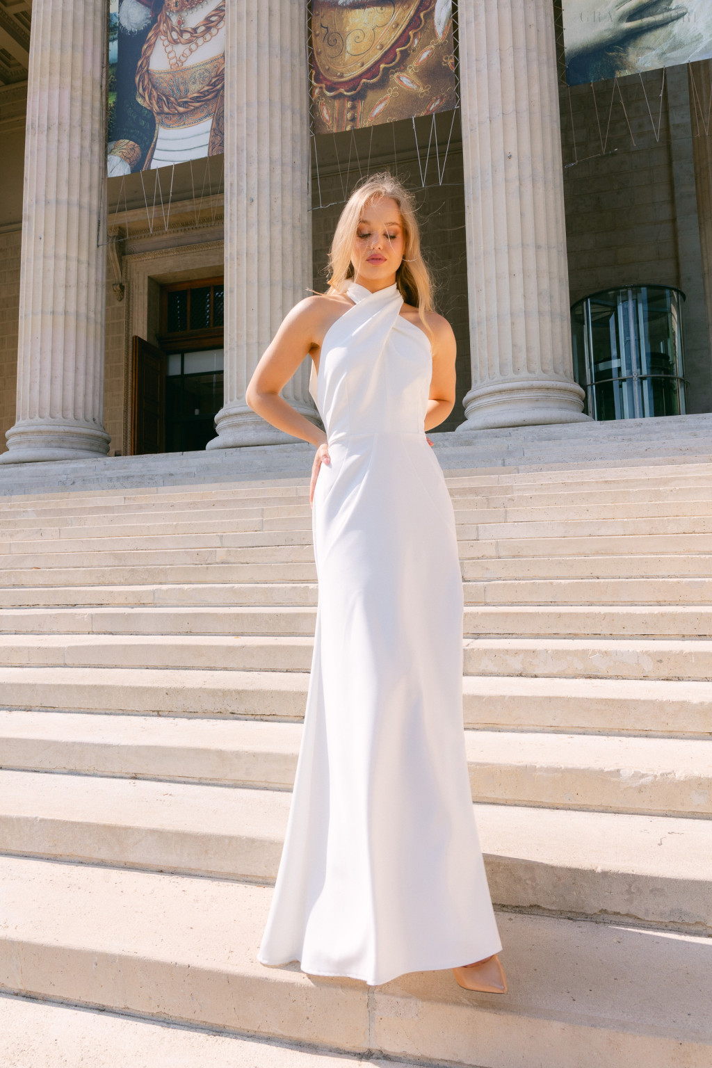 Lia - fehér színű matt anyagú maxi ruha keresztezett felsőrésszel és nyakban megkötős pánttal