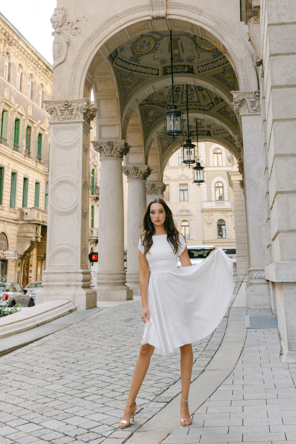 Ez a ruha ideális választás polgári esküvőre vagy átöltözős ruhának a nagy napra, leánybúcsúra  – amikor a kényelem, a könnyedség és az elegancia egyaránt fontos. Andrea megtestesíti a letisztultságban rejlő szépséget, és minden mozdulatban ragyogást visz a pillanatba.