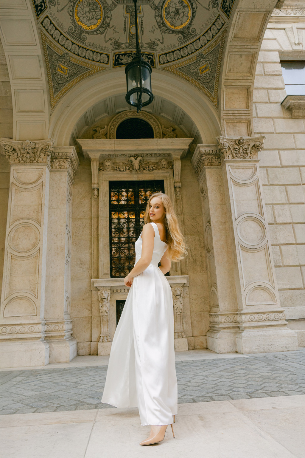 Maya egy light szaténból készült fehér alkalmi ruha, amelyben a letisztultság és az időtlen elegancia találkozik. A szatén könnyed, selymesen fénylő felülete luxusérzetet sugároz, miközben finoman követi a test vonalát, és minden mozdulatot légies bájjal emel ki.
