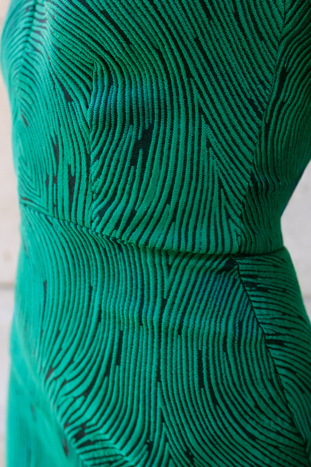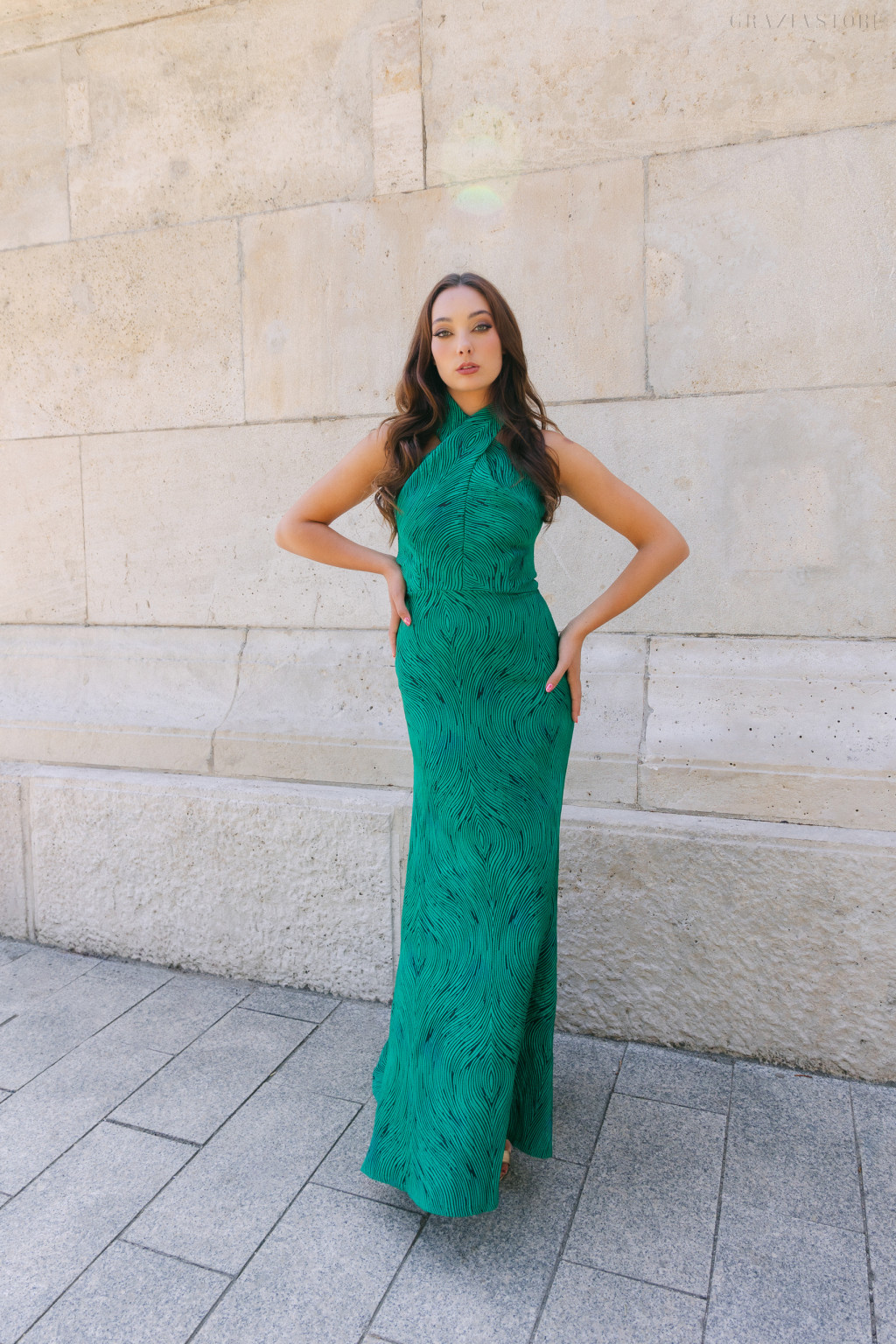 A sötétzöld alapon fekete hullámos mintázat különleges, luxus hatást kelt, a jacquard szövet gazdag textúrája pedig minden részletében prémium megjelenést sugall. A nyakban megkötős, elöl keresztezett felsőrész játékosan emeli ki a dekoltázst, egyedi, mégis kifinomult stílust kölcsönözve. A szűkszabású, testhez simuló fazon kiemeli az alakot, míg a maxi hosszúság eleganciát és magabiztosságot sugall.