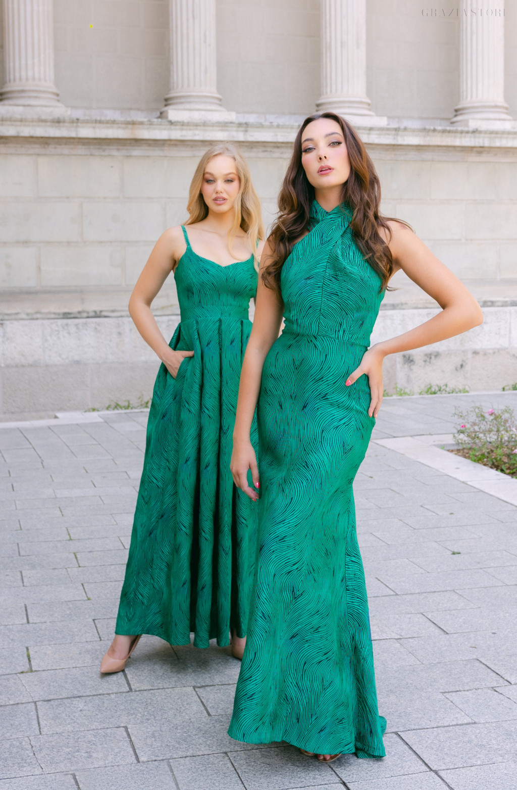 A sötétzöld alapon fekete hullámos mintázat különleges, luxus hatást kelt, a jacquard szövet gazdag textúrája pedig minden részletében prémium megjelenést sugall. A nyakban megkötős, elöl keresztezett felsőrész játékosan emeli ki a dekoltázst, egyedi, mégis kifinomult stílust kölcsönözve. A szűkszabású, testhez simuló fazon kiemeli az alakot, míg a maxi hosszúság eleganciát és magabiztosságot sugall.