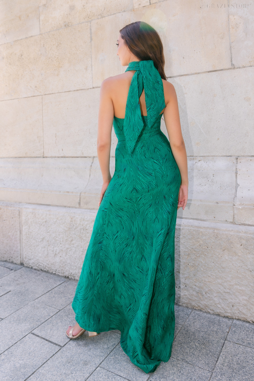 A sötétzöld alapon fekete hullámos mintázat különleges, luxus hatást kelt, a jacquard szövet gazdag textúrája pedig minden részletében prémium megjelenést sugall. A nyakban megkötős, elöl keresztezett felsőrész játékosan emeli ki a dekoltázst, egyedi, mégis kifinomult stílust kölcsönözve. A szűkszabású, testhez simuló fazon kiemeli az alakot, míg a maxi hosszúság eleganciát és magabiztosságot sugall.