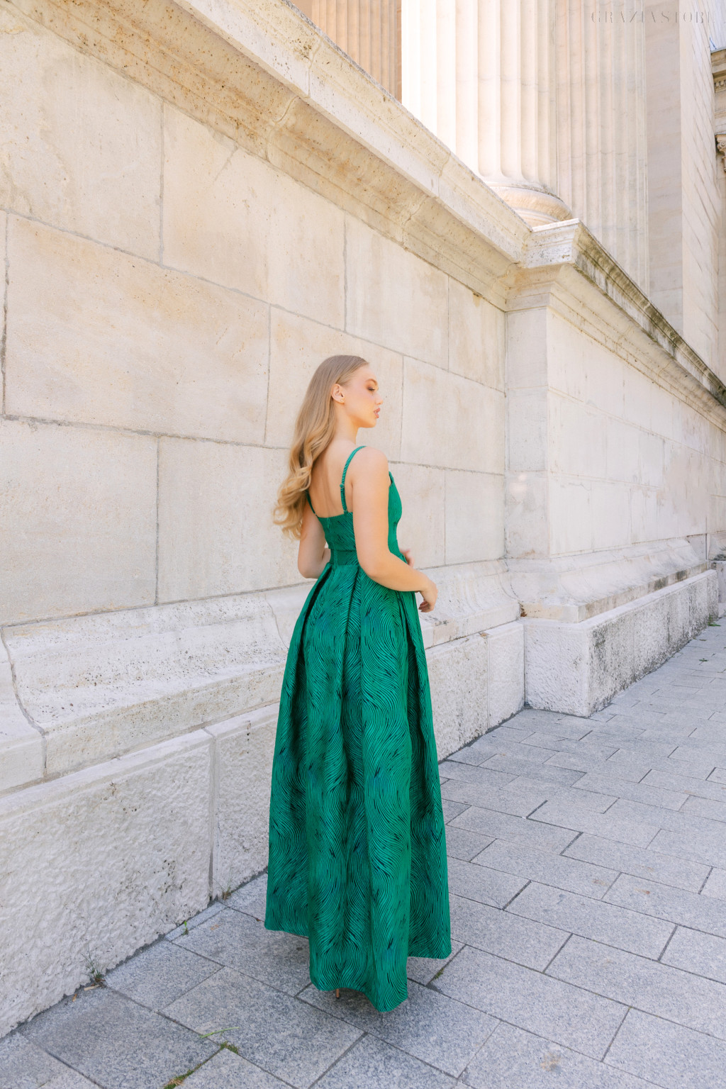 Engedd, hogy Chloe maxi ruha a figyelem középpontjába állítson! Ez a lenyűgöző alkalmi ruha jacquard anyagból készült, sötétzöld alapon fekete hullámos mintázattal, ami luxusérzetet áraszt. A romantikus szív kivágás finom, nőies vonalat kölcsönöz, míg az állítható pántok tökéletes illeszkedést biztosítanak minden testalkathoz.