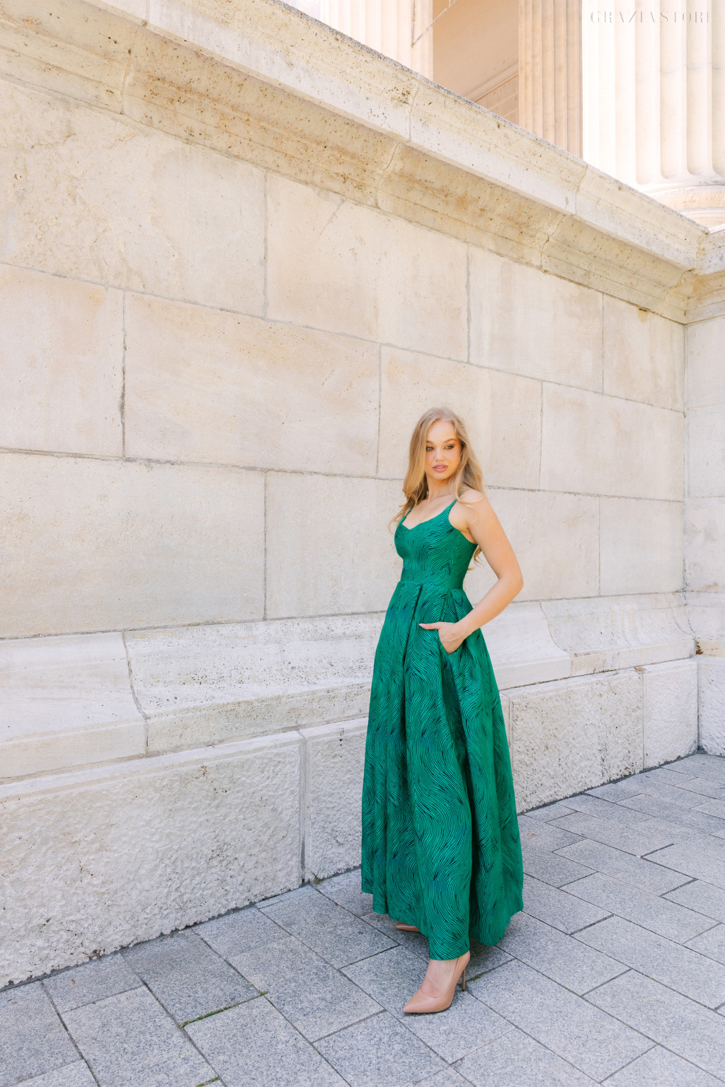 Az A-vonalú, többrakásos szoknya áramló, könnyed mozgást ad, miközben a rakások dinamizmust és eleganciát sugároznak. Ez a nőies, maxi alkalmi ruha tökéletes választás esküvőkre, estélyekre vagy bármilyen különleges alkalomra, ahol a stílus és a harmónia számít.