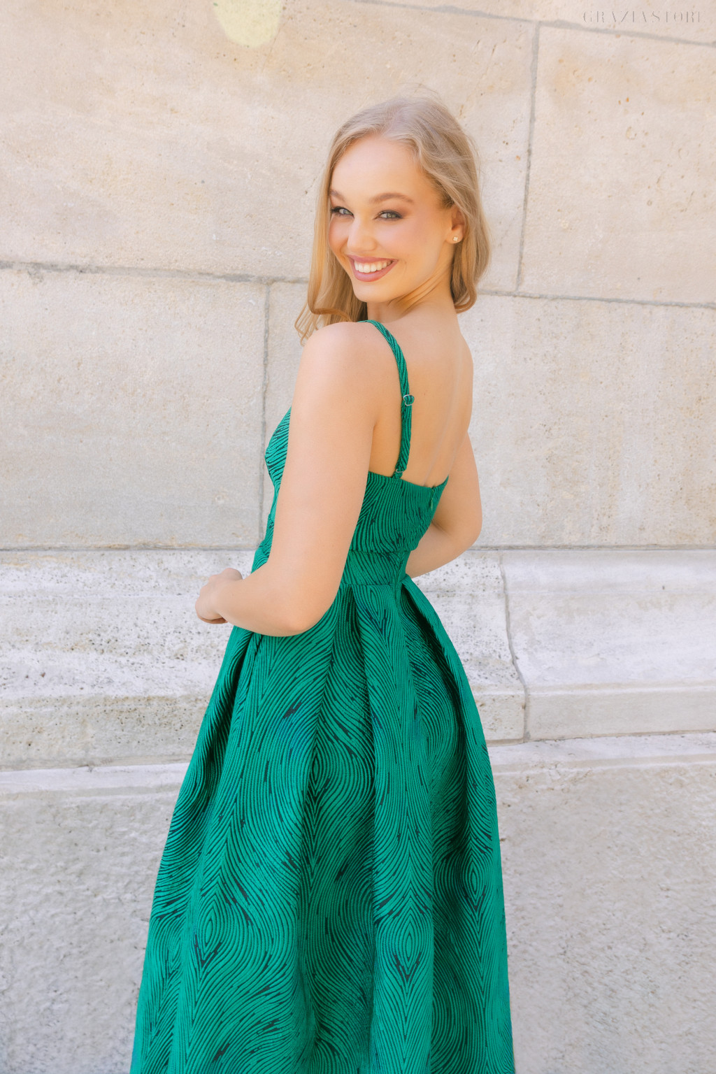 Engedd, hogy Chloe maxi ruha a figyelem középpontjába állítson! Ez a lenyűgöző alkalmi ruha jacquard anyagból készült, sötétzöld alapon fekete hullámos mintázattal, ami luxusérzetet áraszt. A romantikus szív kivágás finom, nőies vonalat kölcsönöz, míg az állítható pántok tökéletes illeszkedést biztosítanak minden testalkathoz.