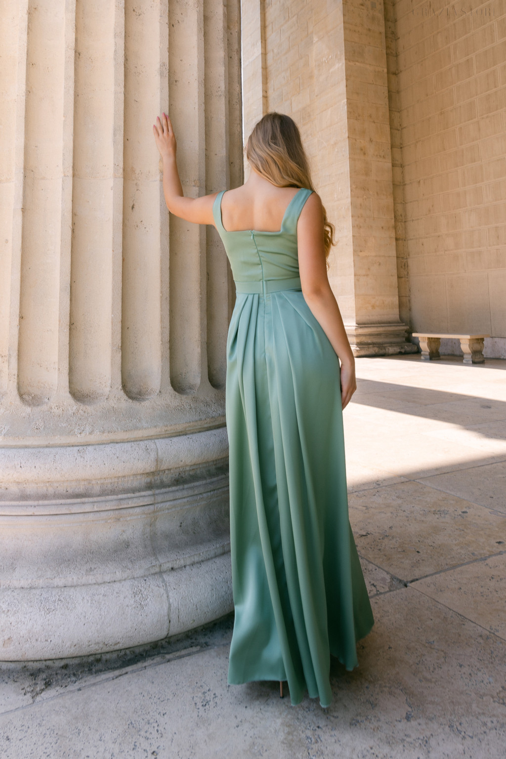 Maya egy zsálya színű, lágy szaténból készült alkalmi ruha, amely letisztult, elegáns felsőrésszel és átlapolt, rakásos maxi szoknyával varázsolja el a megjelenést.