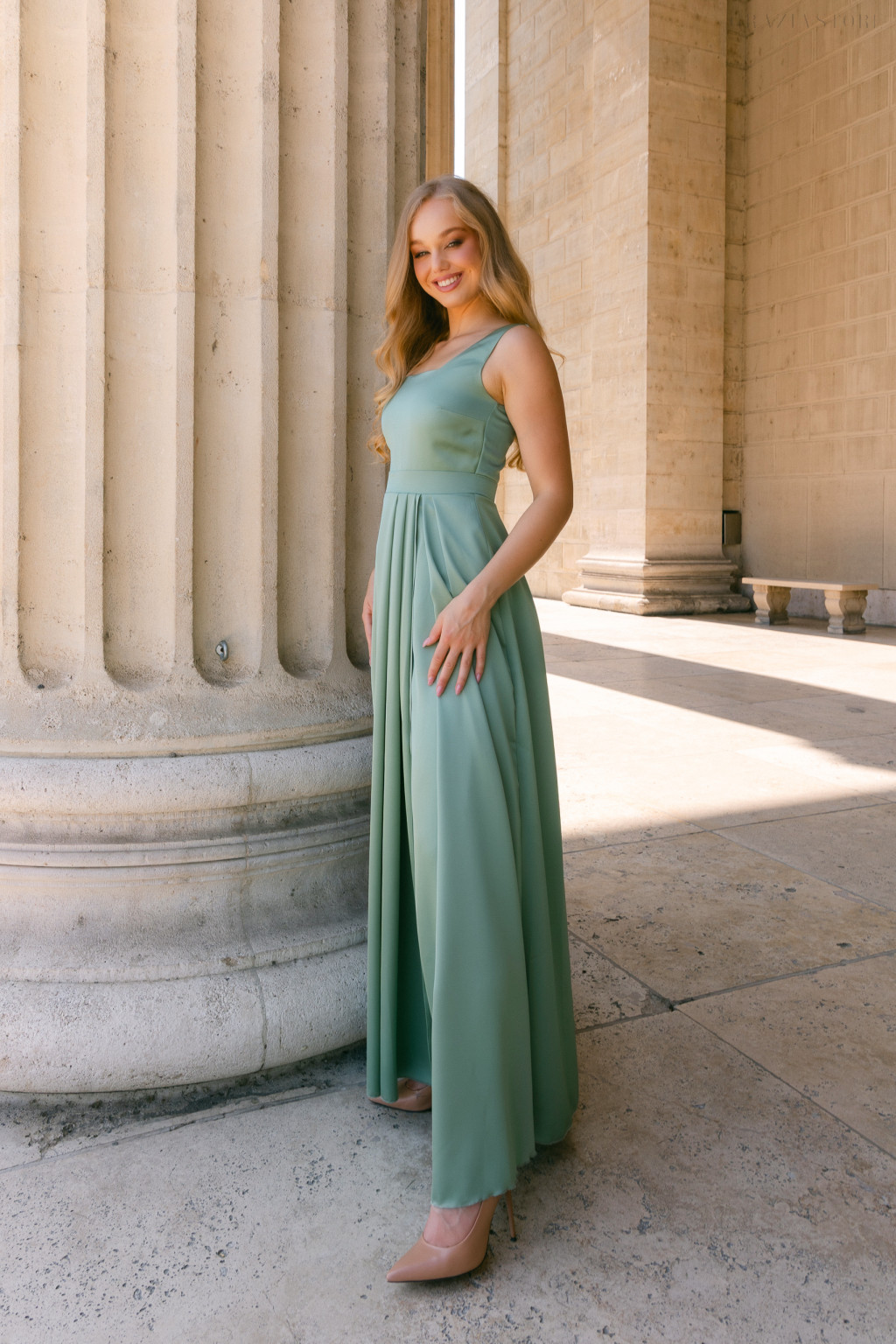 Maya egy zsálya színű, lágy szaténból készült alkalmi ruha, amely letisztult, elegáns felsőrésszel és átlapolt, rakásos maxi szoknyával varázsolja el a megjelenést.