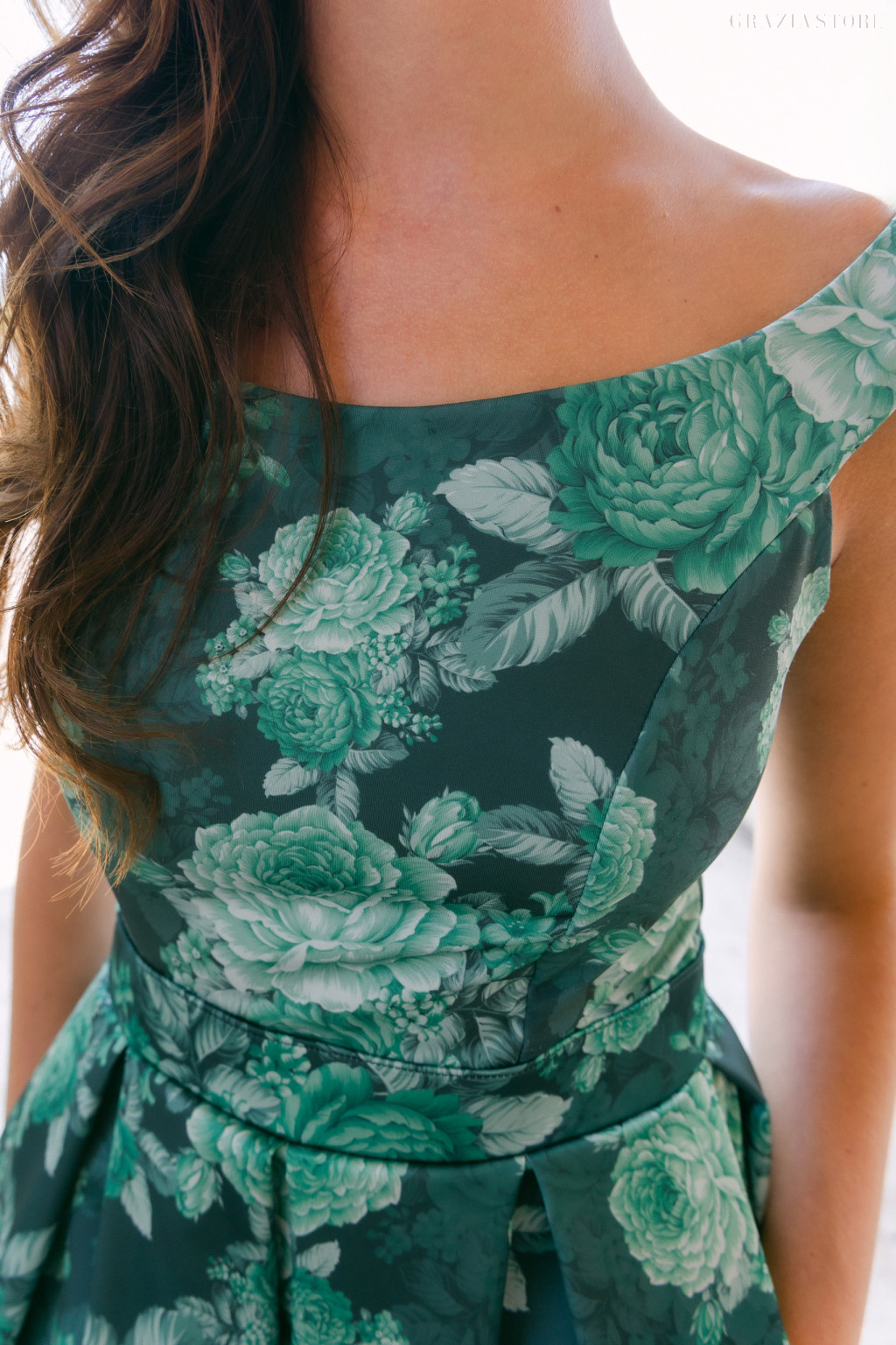 A virágmintás design elegáns és időtlen, amely játékos frissességet visz a klasszikus maxi ruhába. A fényes szatén anyag luxust sugall, a réteges, többrakásos szoknya pedig minden mozdulatnál áramló könnyedséget és kifinomult térfogatot biztosít, így a ruha szinte életre kel, amikor megmozdulsz benne. A sötétzöld alap és a gazdag virágminták különleges kontrasztot teremtenek, melyek esti fényben és természetközeli környezetben egyaránt ragyognak.