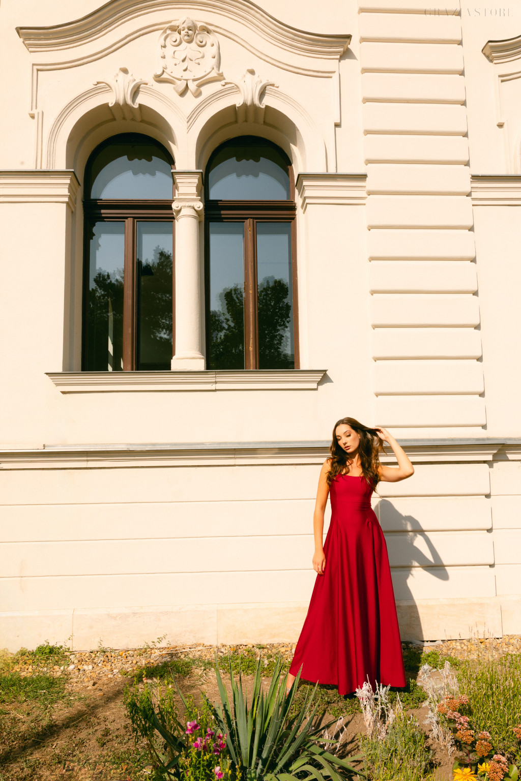 A ruha különlegessége, hogy nem derékban szabott, hanem a szűkebb felsőrészből lágyan, A-vonalban bővül lefelé. Ez a megoldás nyújtja az alakot, miközben könnyed mozgásszabadságot biztosít, és finoman kiemeli a nőies sziluettet anélkül, hogy túl szorosan körbefogná a derekat.