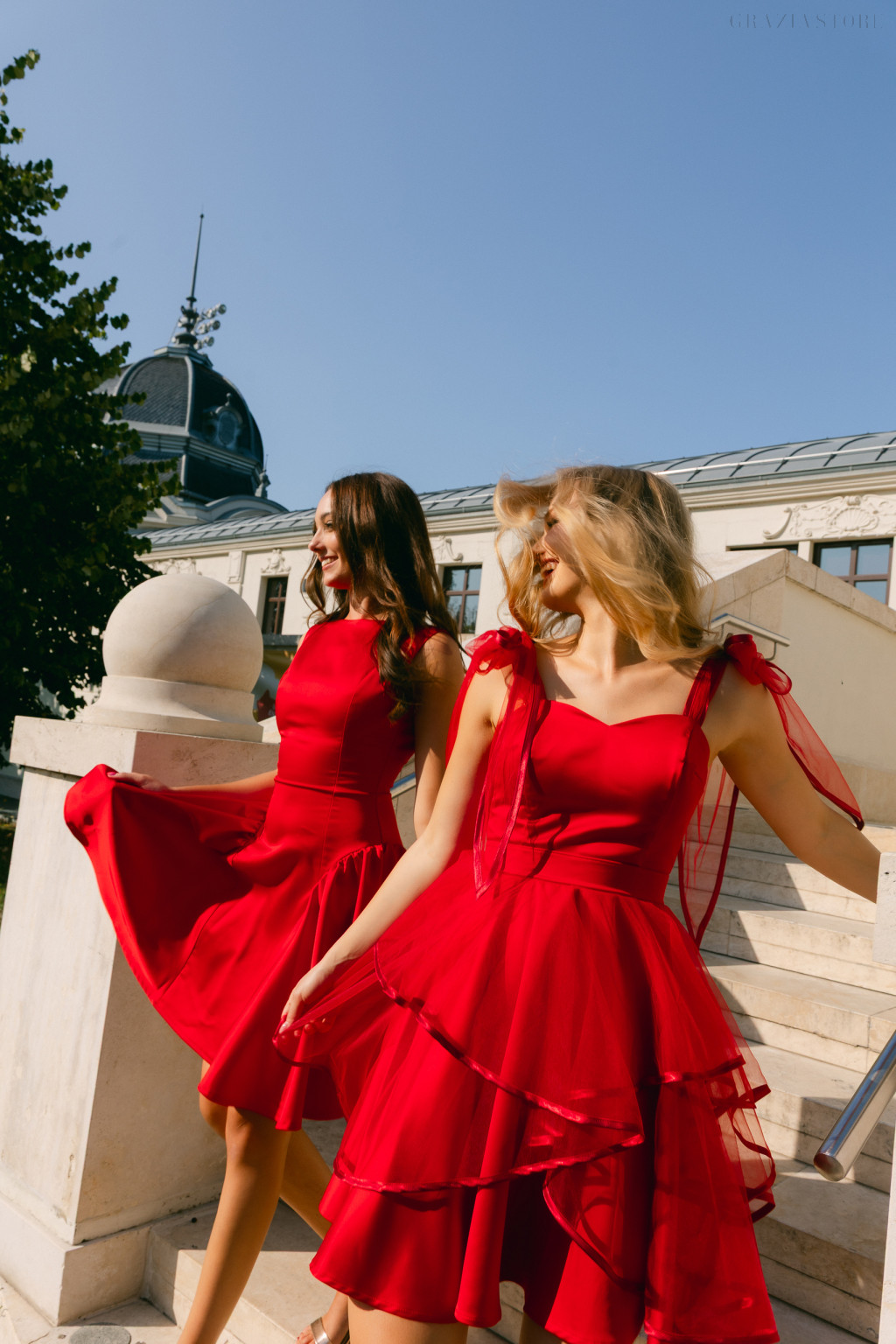 Elena – Červené saténové mini šaty s tylovou sukňou a s ramienkami so zaväzovaním na mašľu