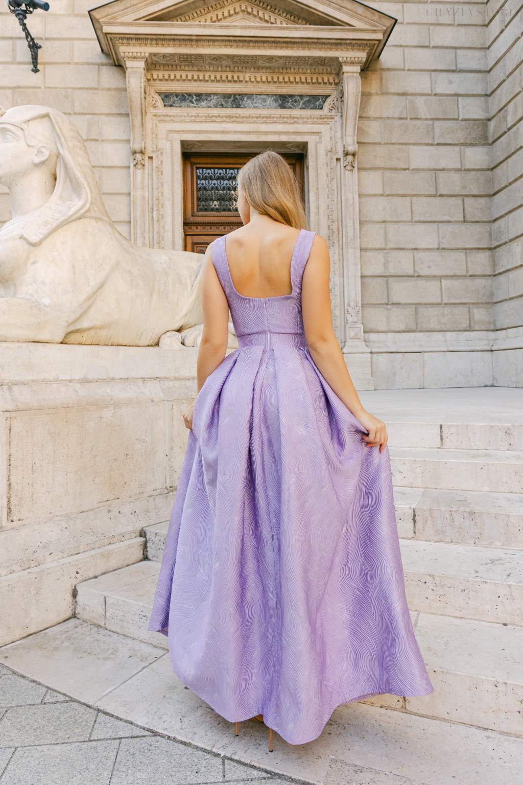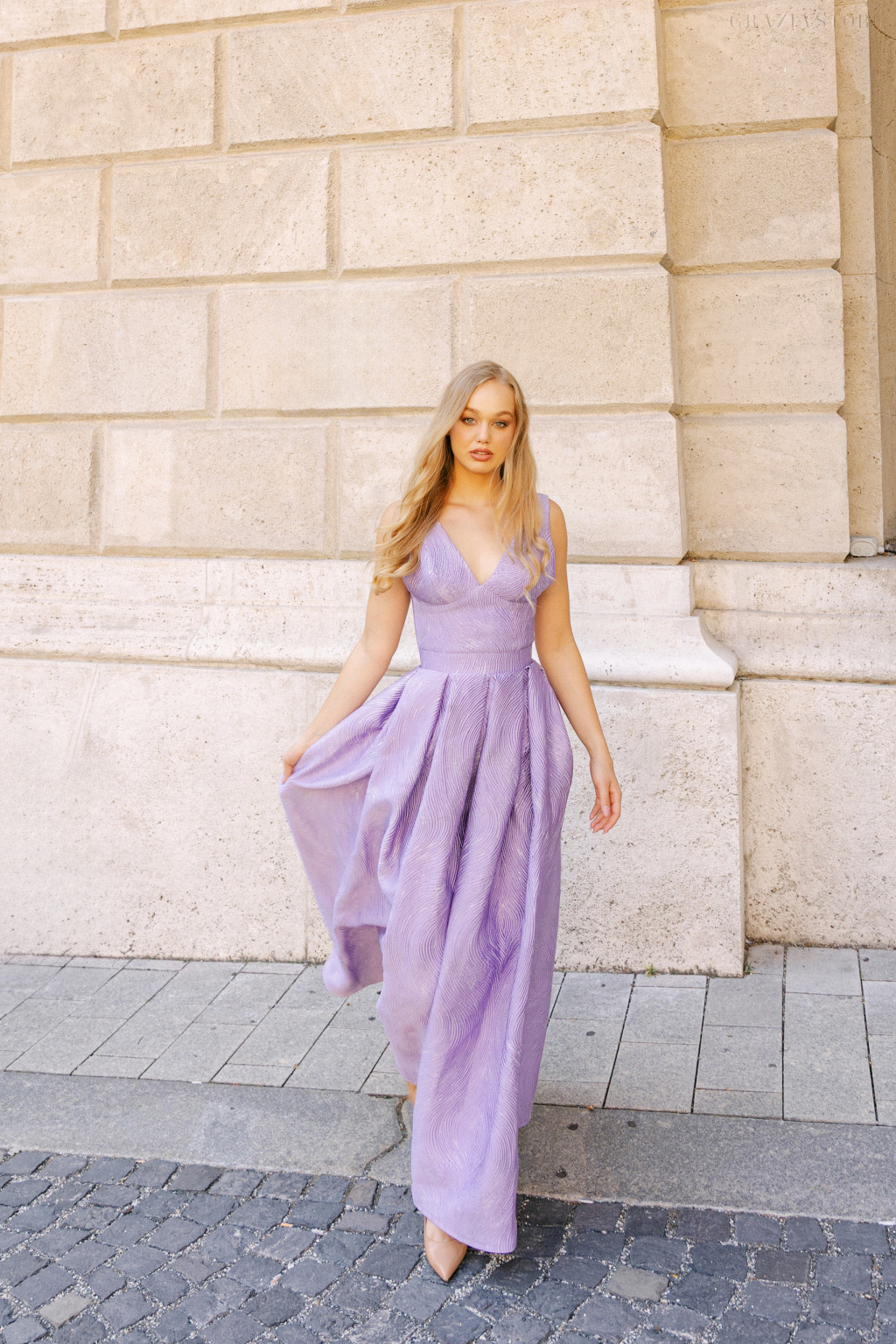 Szonja egy igazán lenyűgöző maxi ruha, amely hercegnői megjelenést és modern eleganciát ötvöz. A lila árnyalat magával ragadó, különleges és nőies, míg az anyagában mintás jacquard szövet gazdag textúrájával és finom mintázatával luxusérzetet áraszt. A több rakású, A vonalú szoknya bőséges térfogatot biztosít, miközben praktikus zsebei könnyedséget és modern stílust csempésznek a ruhába.